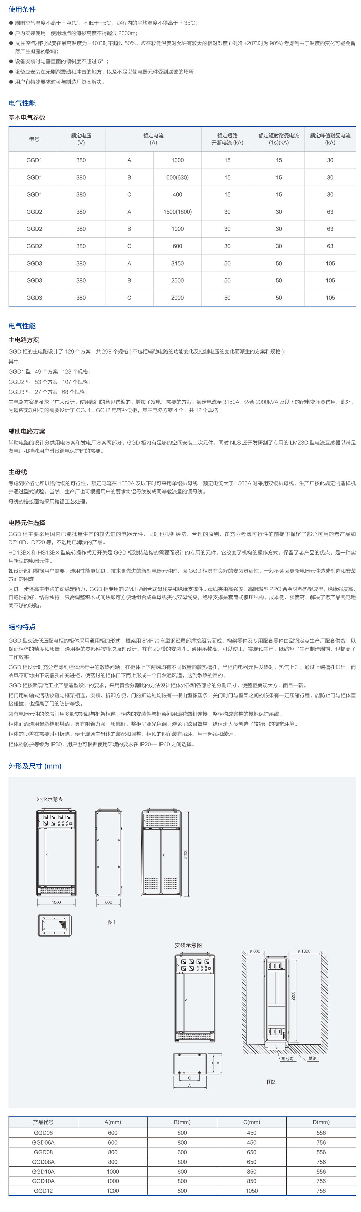 GGD型交流低压配电柜适用于发电厂、变电站、厂矿企业等电力用户的交流50Hz,额定工作电压380V,额定工作电流至3150A的配电系统,作为动力、照明及配电设备的电能转换、分配与控制之用。