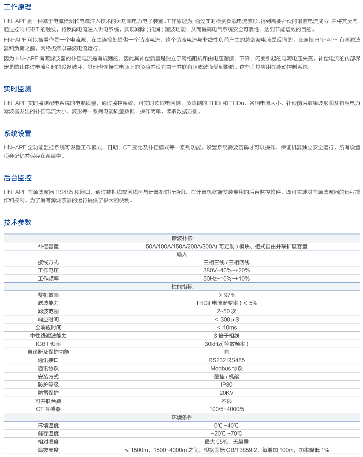 HN-APF有源电力滤波器是动态滤除谐波的新一代谐波治理解决方案,采用先进的动态实时跟踪补偿方式消除电网谐波,通过实时监测由非线性负载所产生的电流波形,分离出谐波部分,将大小相对,方向相反的谐波电流注入到电网中,实现滤除谐波的功能。各项技术性能指标均达到国内外同类产品同等水平,成本和技术都有革命性突破,新型工艺设计使机器体积大大减小,节省了机房宝贵的空间,大大降低了企业用户使用有源滤波器技术的门槛。