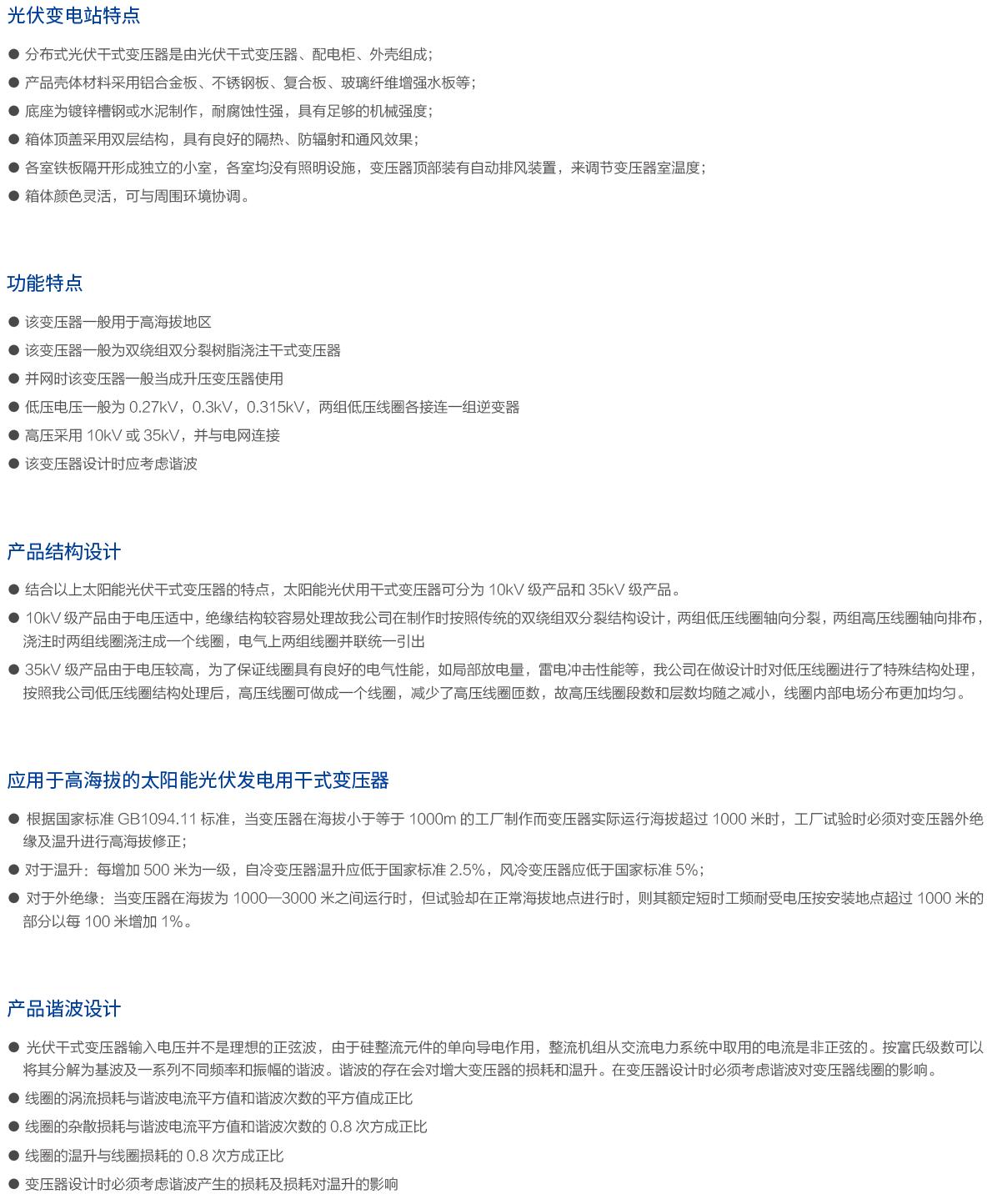 随着太阳能光伏发电产业的规模不断扩大,光伏发电用干式变压器产品的需求量逐年增多,为了扩大市场份额,提升企业竞争力,我公司专门针对该产品的技术特点开发了太阳能光伏用双绕组双分裂干式变压器。